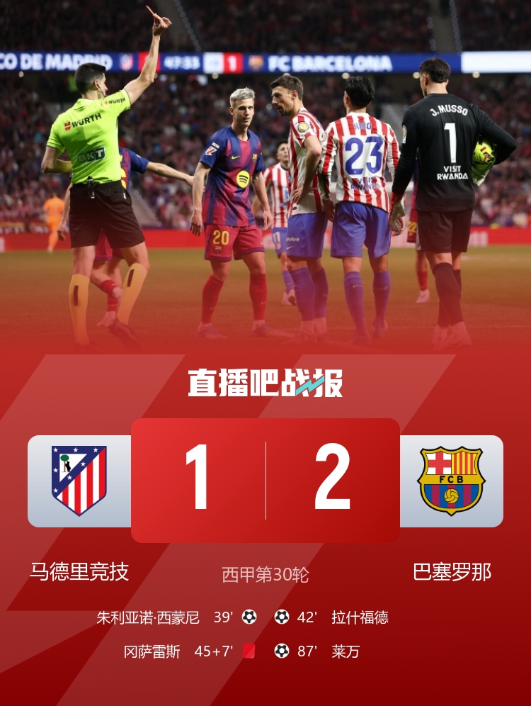 莱万绝杀!巴萨2-1逆转十人马竞 冈萨雷斯1黄1直红马丁直红改黄牌